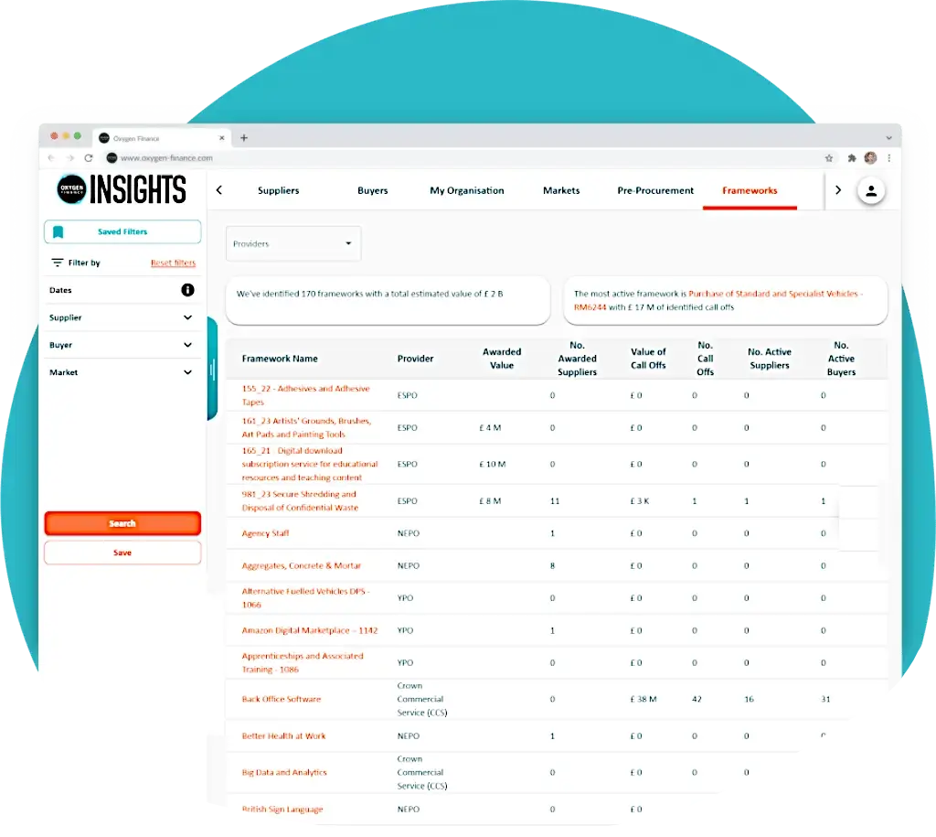 Combine Frameworks data with Oxygen Insight's Pre-Procurement, Spend Intelligence, Notices, and Contracts data for an unparalleled view of your public sector market.